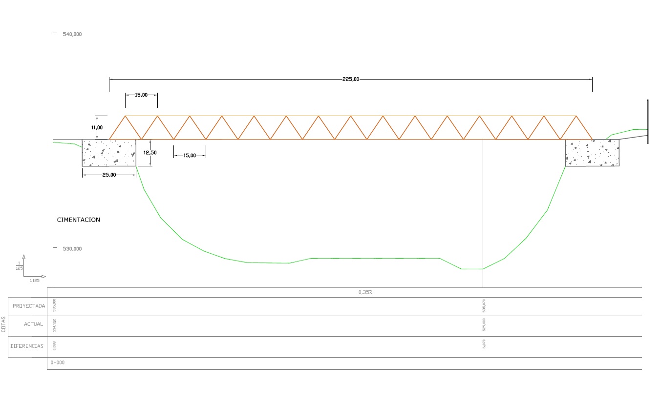 PERFIL LONGITUDINAL DE PASARELA METALICA PEATONAL SOBRE ENCAUZAMIENTO.